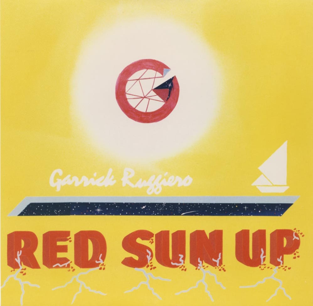 Roger Shony from Schenectady NY was the artist for Uncle Fuzzy's Deli. Fifteen years after losing touch I looked him up and he graciously offered to help me with this design – an album cover with a yellow background, a white sun in the center and the words Red Sun Up in block lettering.